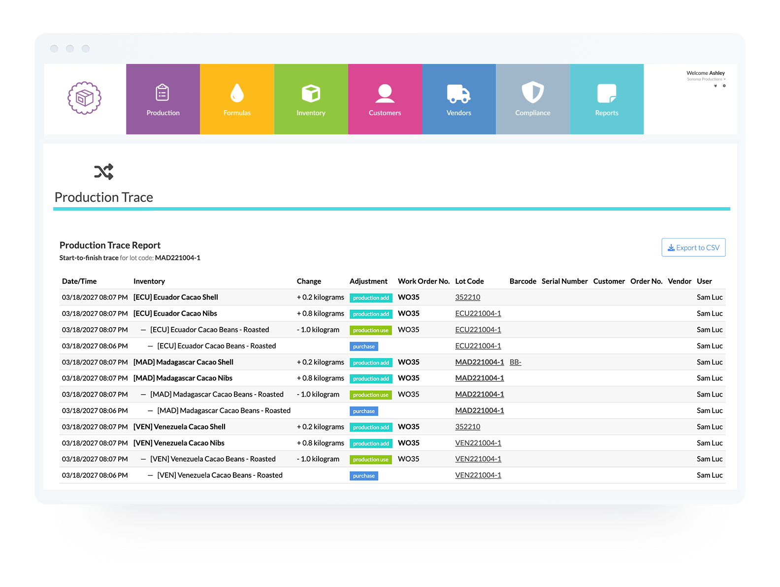 Track everything used in your product business, including the user who did the transaction, the date and time, and all the associated costs as well. A button click generates full traceability reports showing material still in your facility and what went to customers.